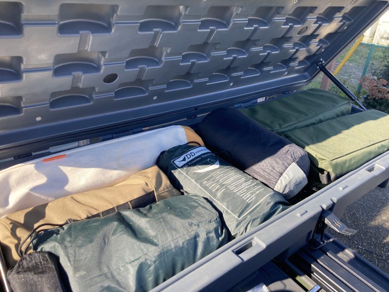 今回83Lを使用してみてわかったこと、それは83Lは絶妙な素晴らしいサイズであり十分すぎる収納力をもっていることです。写真に掲載しているように83Lのケースには様々なキャンプギアを収納することができます。画像に写っている通りコット2本、マット1つ、ハンモック、タープ、チェア、テーブル、コットの下にはユニフレームのフィールドラック2つと、フィールドラックの天板2つ入っています。フィールドラックの上にさらにコットが積載できるほどの厚みがあるということが驚きです。
